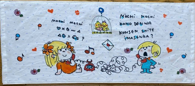サイズ:34×80cm。綿100%. オフホワイト地に懐かしの昭和レトロなイラストが可愛い!アルファベットが並んでると何語かな?と思っちゃうけど、、亜土ちゃんのばあいは何とローマ字で書かれた日本語だから全部読めるね!