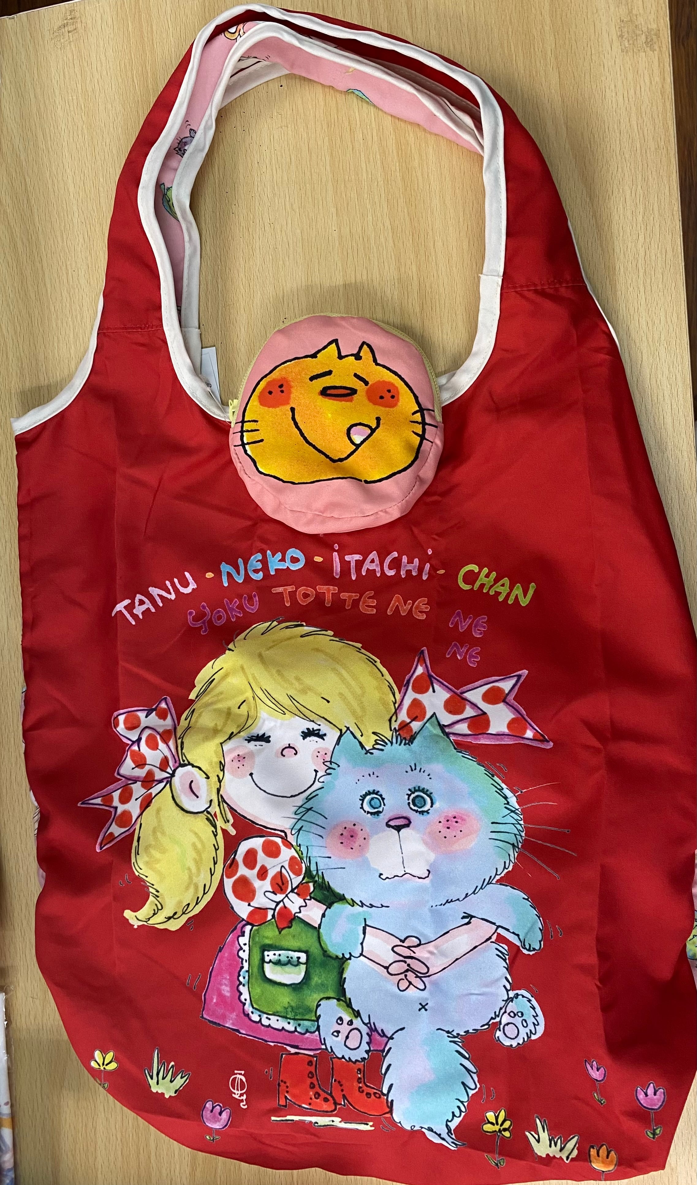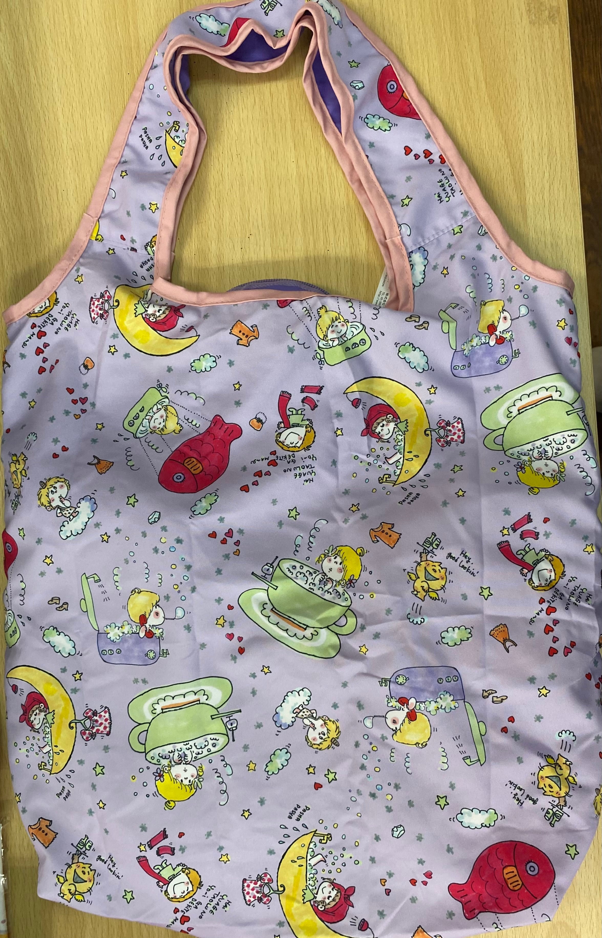 収納時のポーチの可愛さ!エコバッグの表側の大胆なイラスト使い!裏側のチラシ柄!亜土ちゃんのイラストを思いっきり使ったデザインの豊かさは秀逸!