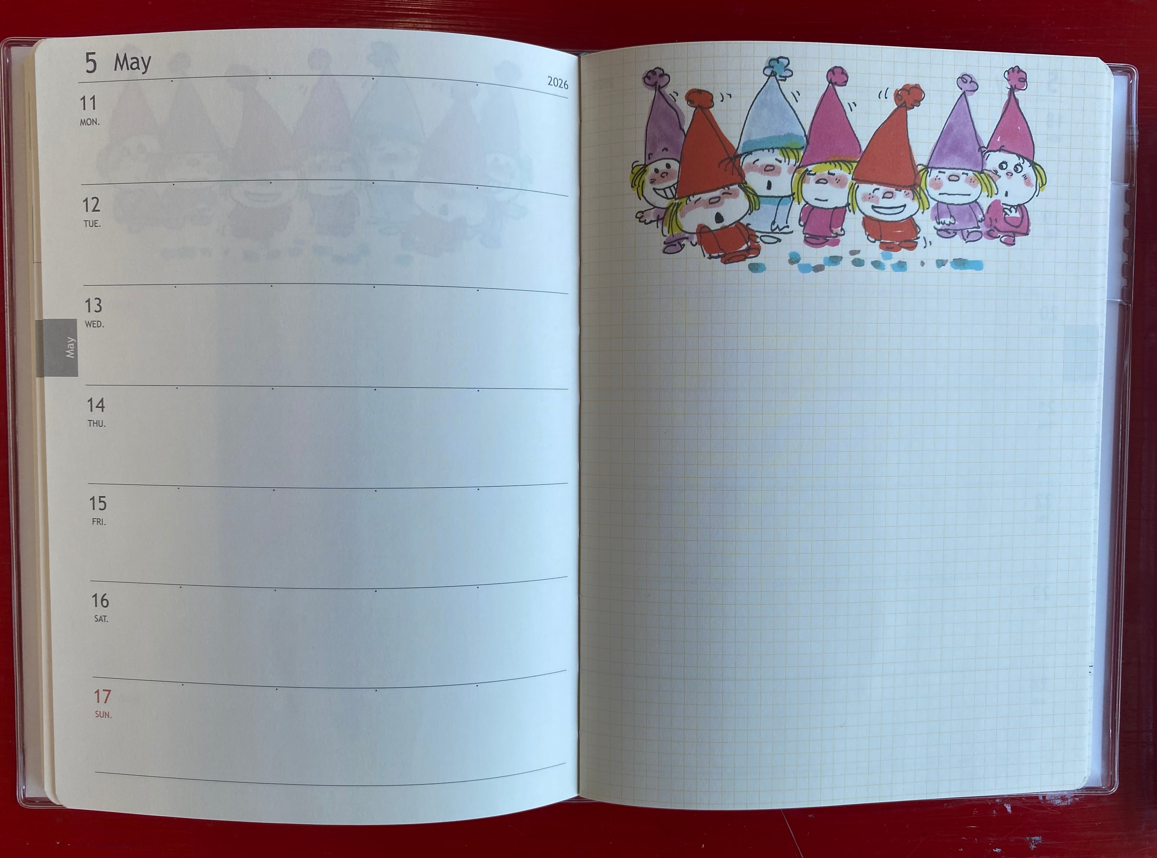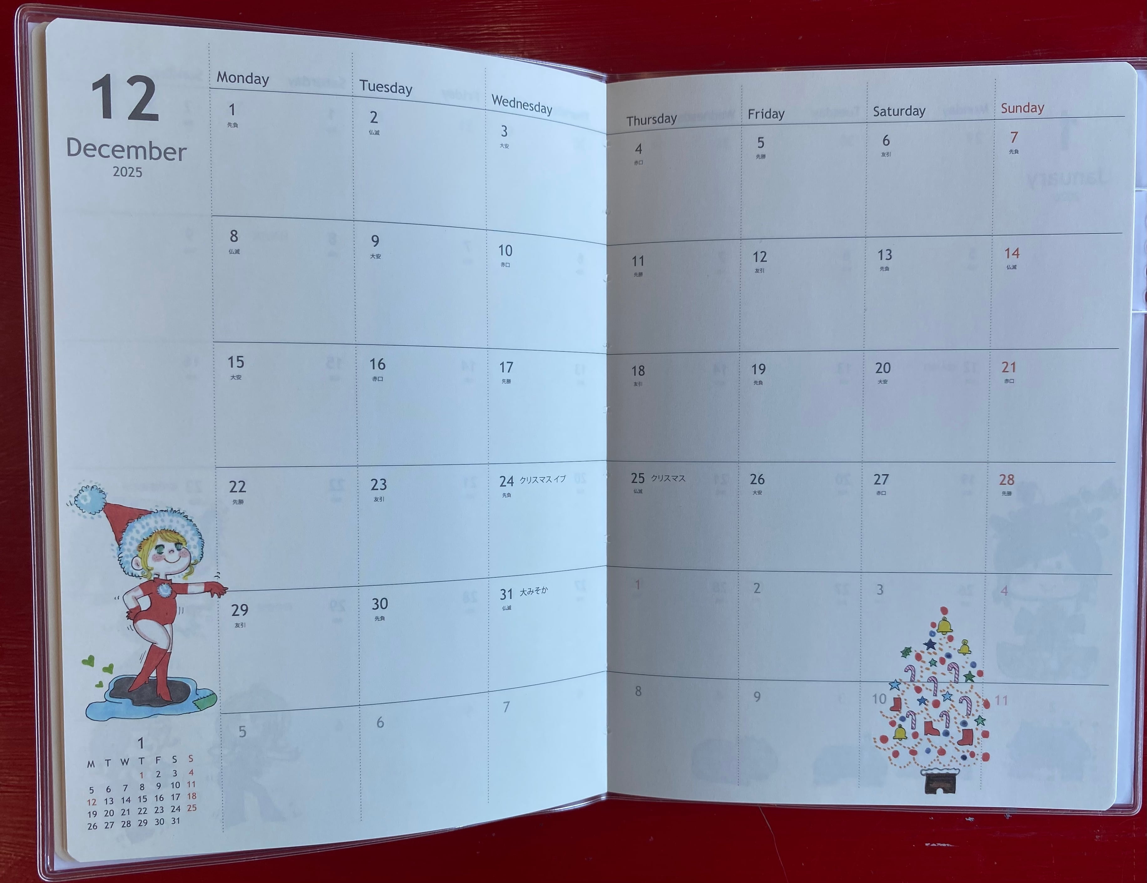 B6サイズ(約18.5×13cm)厚さは約1cm(月間のみの手帳は約半分)。透明カバー付きです。月間スケジュールは2025年10月~2026年12月まで。週間スケジュールは2025年12月~2026年12月まで。カレンダー(2026年・2027年)年間プラン・メモページもたっぷり充実。便利な各種情報ページなど、使い勝手も良く、全ページに亜土ちゃんのイラストが散りばめられていて、楽しくスケジュールが立てられちゃいます。