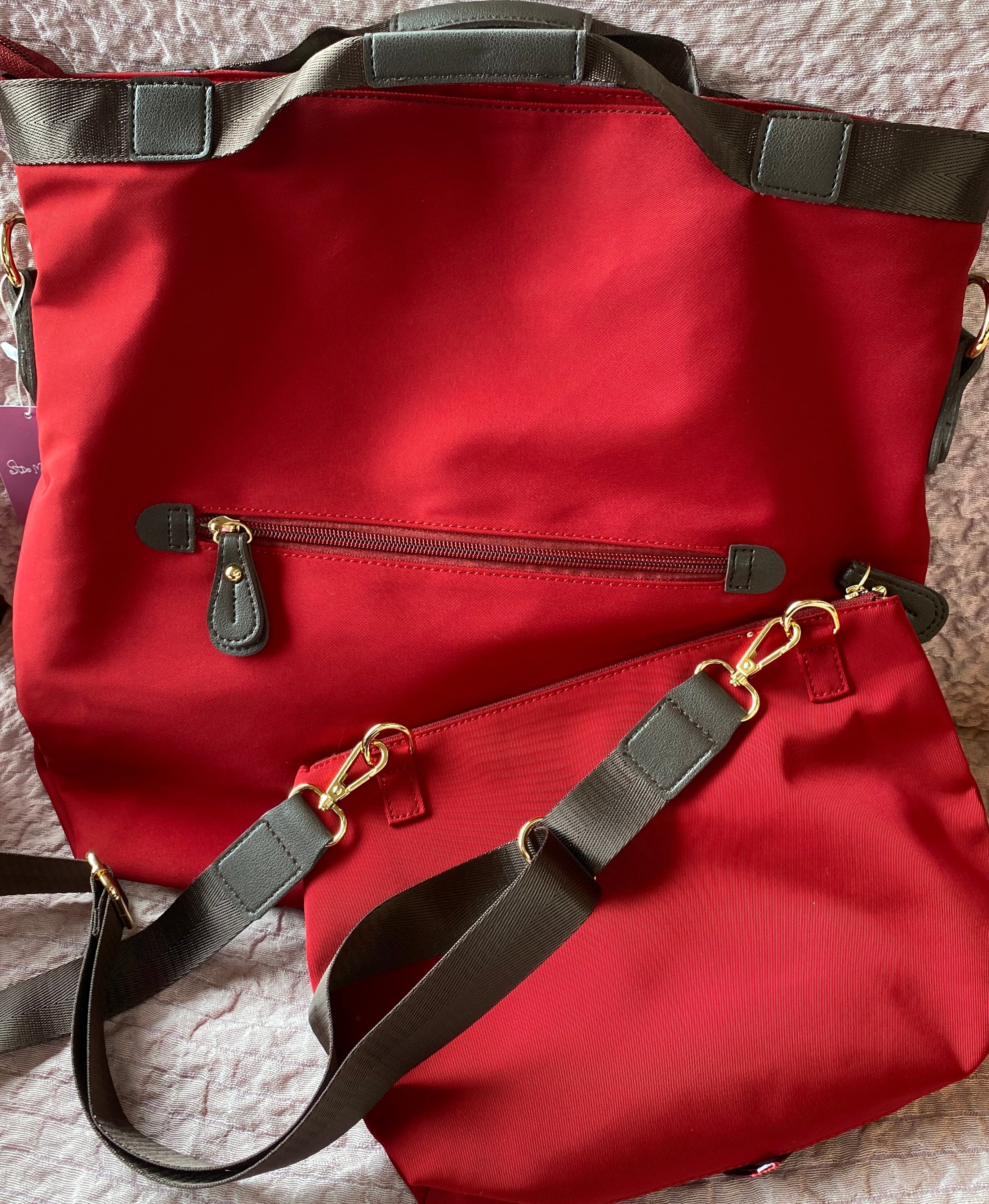 2020年秋冬バージョン 光沢のあるスカーフ生地にイラストを鮮やかにプリントした魅力的な亜土ちゃんのアンニュイガールが映えるバッグ!ポーチと共用のショルダーベルトが付いた使い勝手抜群の3点セットです。人気のブラックとバーガンディレッドの2色からお選びください。サイズはバッグ: 33×32〜39cm マチ12cm ポーチ: 18×26×6cm お洒落な持ち手も付いてるので、バッグとポシェットとして、1泊旅行などにピッタリ!