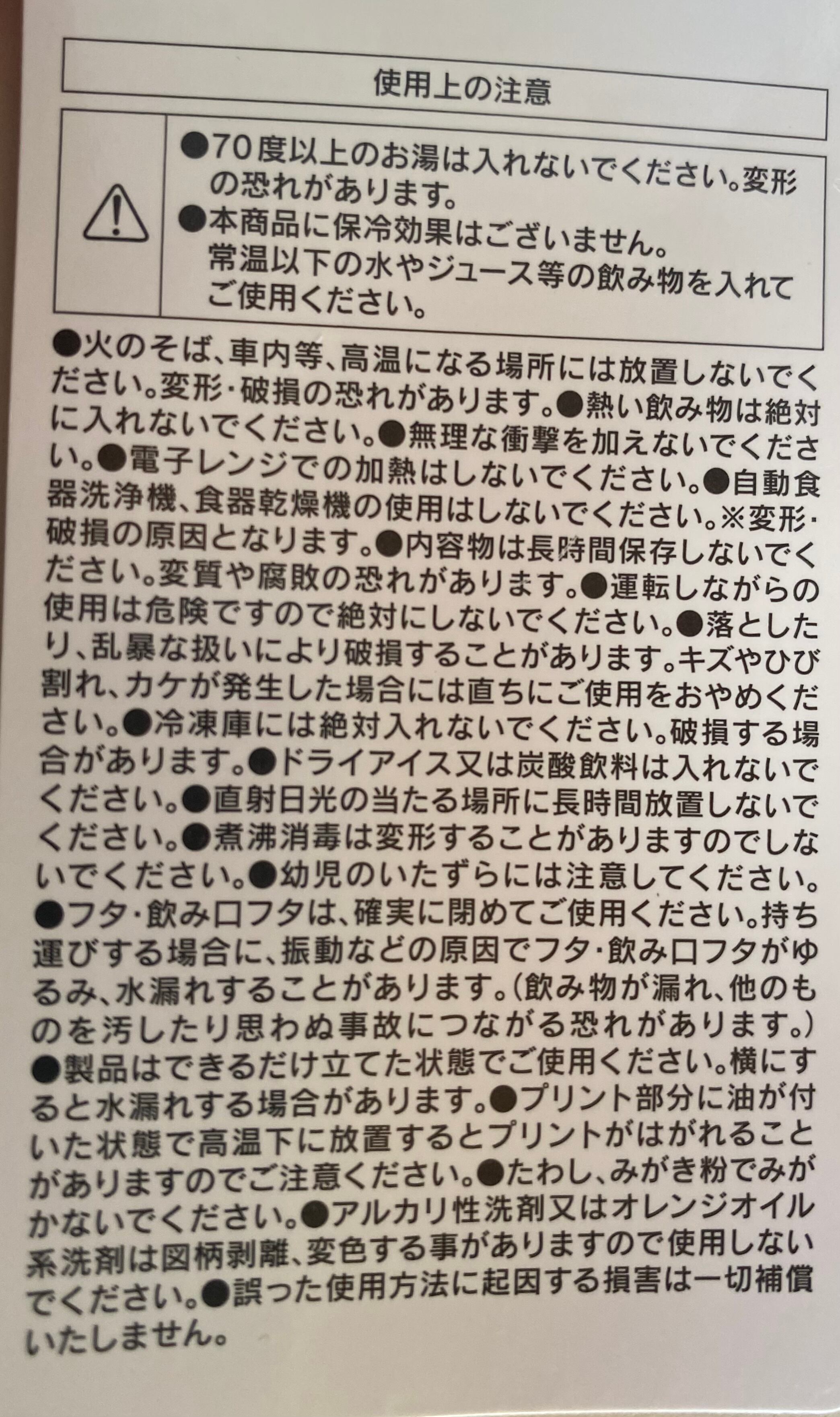 サイズ:高さ約20cm 底直径約6.5cm。 容量約500ml。本体はポリエステル樹脂、フタ・飲み口フタはポリプロピレン製です。ガラスではありません。電子レンジや食洗機はご使用になれません。ご使用上の注意をご一読の上、ご注文、ご使用くださいますようお願いいたします。