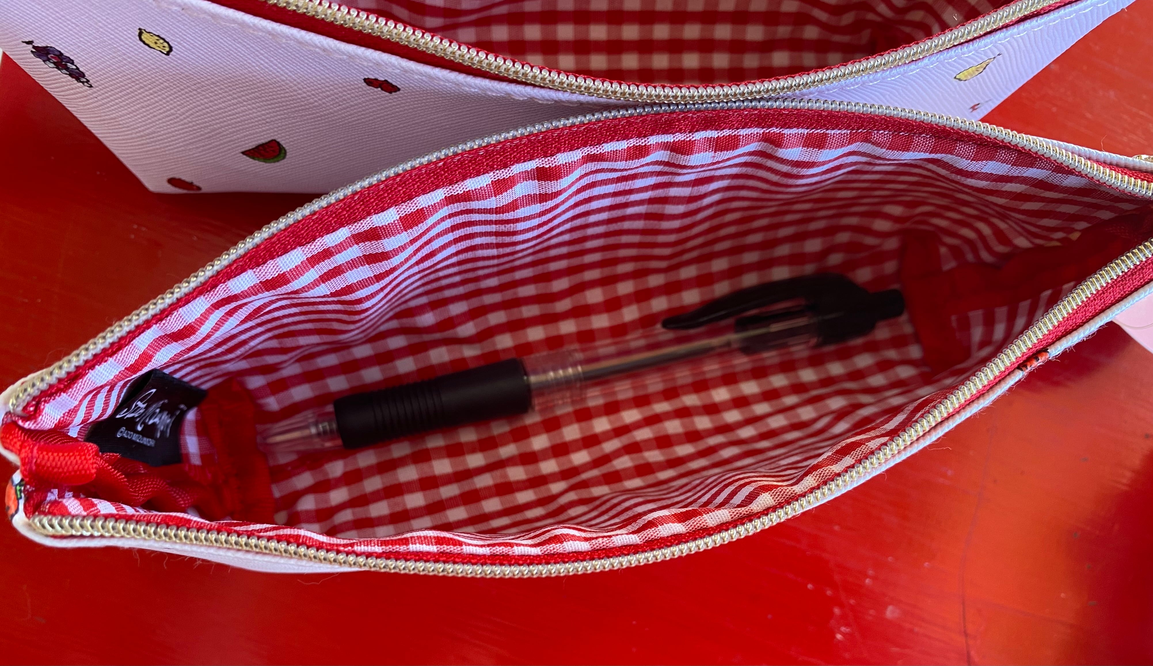 サイズ:約195☓70☓32mm。汚れが付きにくい合皮生地。可愛いイチゴの大きなチャームが付いて、内側には赤いギンガムチェックの裏地付き!バッグの中にあるだけで可愛い!